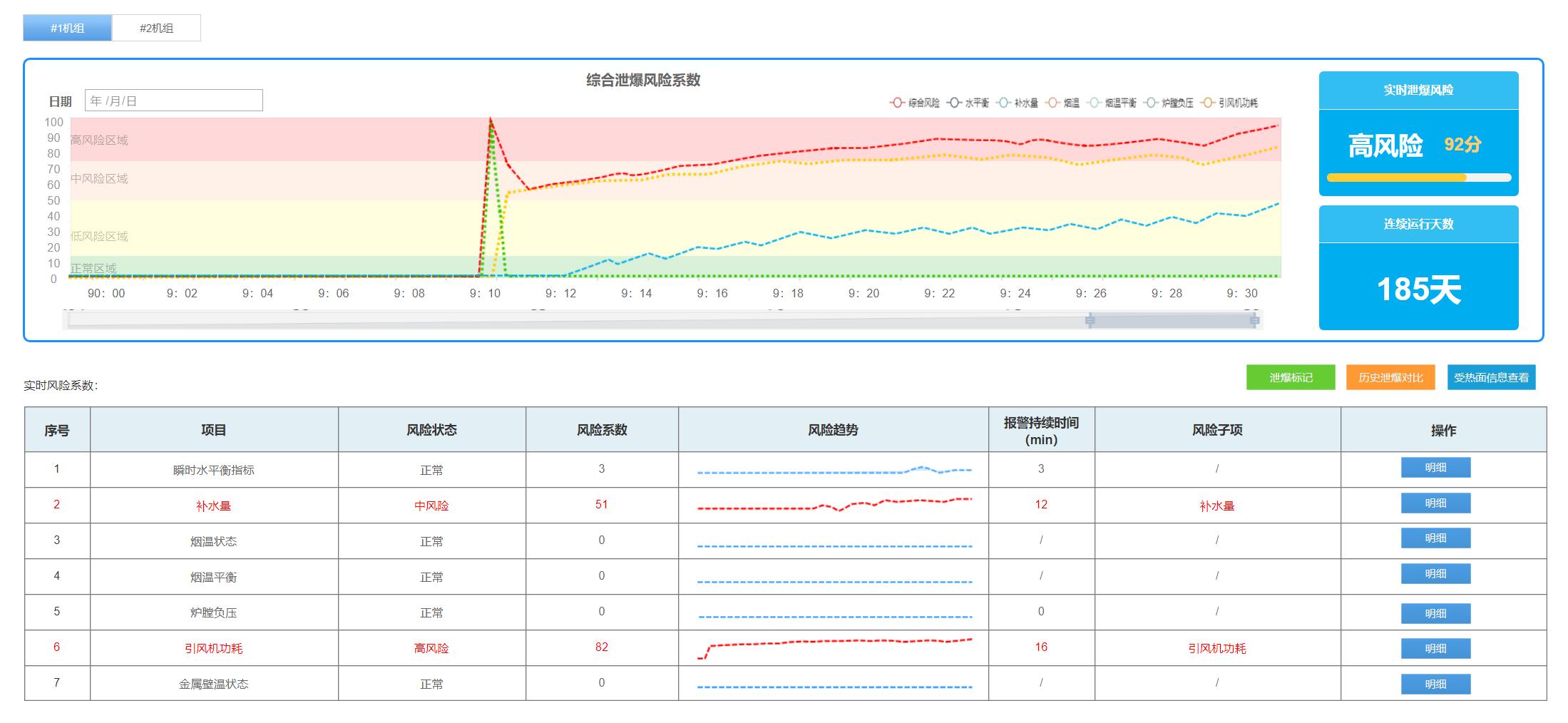 以系統(tǒng)的某電廠實(shí)際案例示例,該電廠防磨防爆可視化管理系統(tǒng)泄爆風(fēng)險監(jiān)控頁面顯示,1號鍋爐在上午9:10膛負(fù)壓指標(biāo)、綜合風(fēng)險指標(biāo)突然上升,隨后爐膛負(fù)壓風(fēng)險指標(biāo)逐漸下降,同時引風(fēng)機(jī)功耗、水平衡指標(biāo)先后逐漸升高。點(diǎn)擊相關(guān)異常項(xiàng)目,分析風(fēng)險指標(biāo)的發(fā)展曲線以及歷史數(shù)據(jù)偏離特征后,初步判定為鍋爐爐膛水冷壁可能存在泄爆,立刻協(xié)調(diào)人員進(jìn)行現(xiàn)場勘查。
